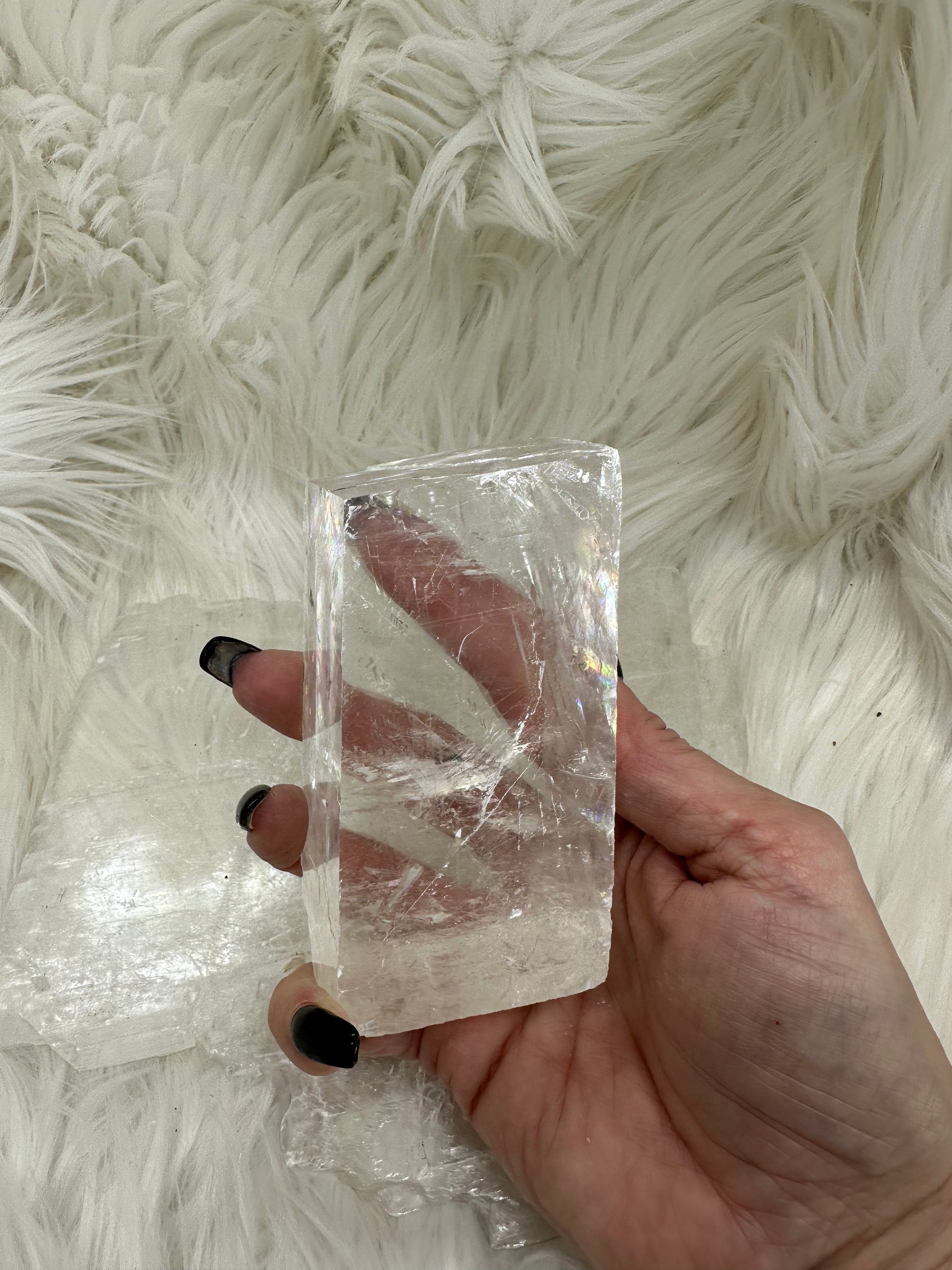 Optical Calcite, also known as Iceland Spar, is a crystal known for its clarity and amplifying properties. It is believed to enhance spiritual awareness, promote mental clarity, and increase focus and concentration.